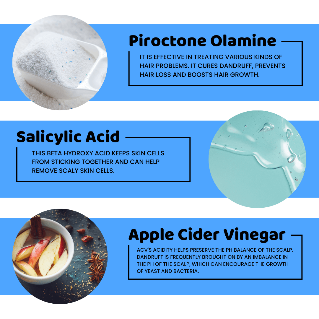 Apple Cider Vinegar- By restoring the scalp's natural pH to its pre-dandruff state, ACV helps reduce dandruff and soothe the scalp.