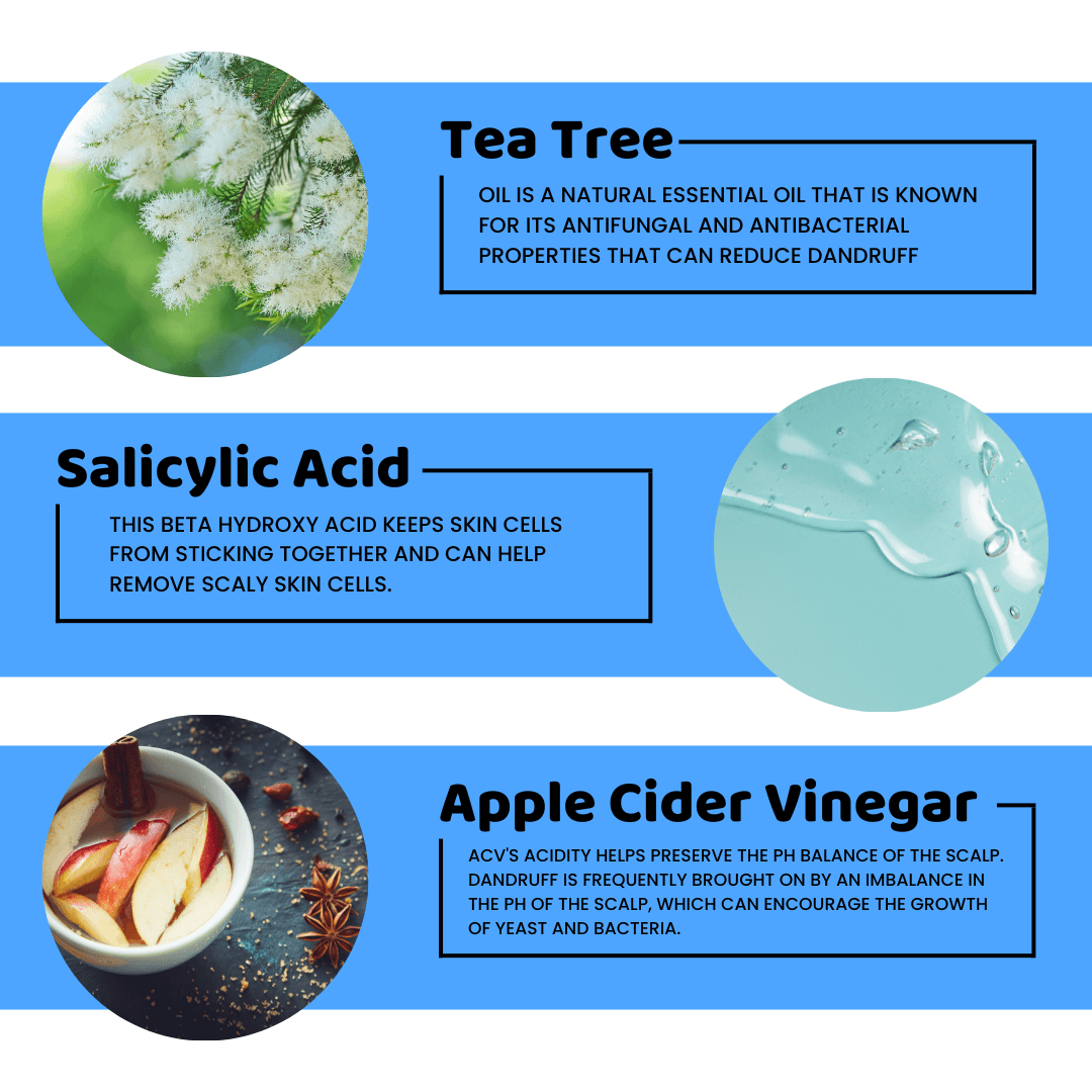 • Soothes the scalp with salicylic acid, apple cider vinegar, tea tree oil, and rosemary.